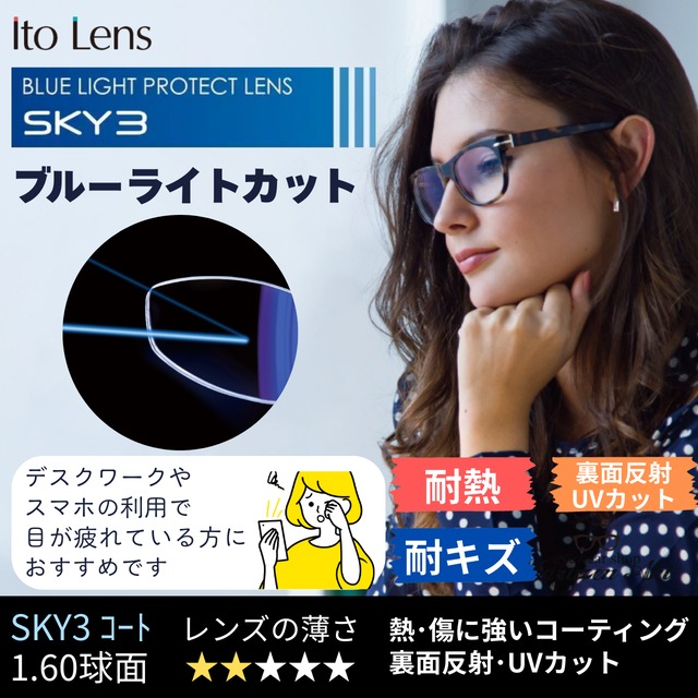 (レンズ単品) ブルーライトカットレンズ 1.60 SKY3 イトーレンズ PC スマホ PCメガネ 耐熱 耐キズ 静電気防止 仕事 学習 まぶしさ 在宅ワーク
