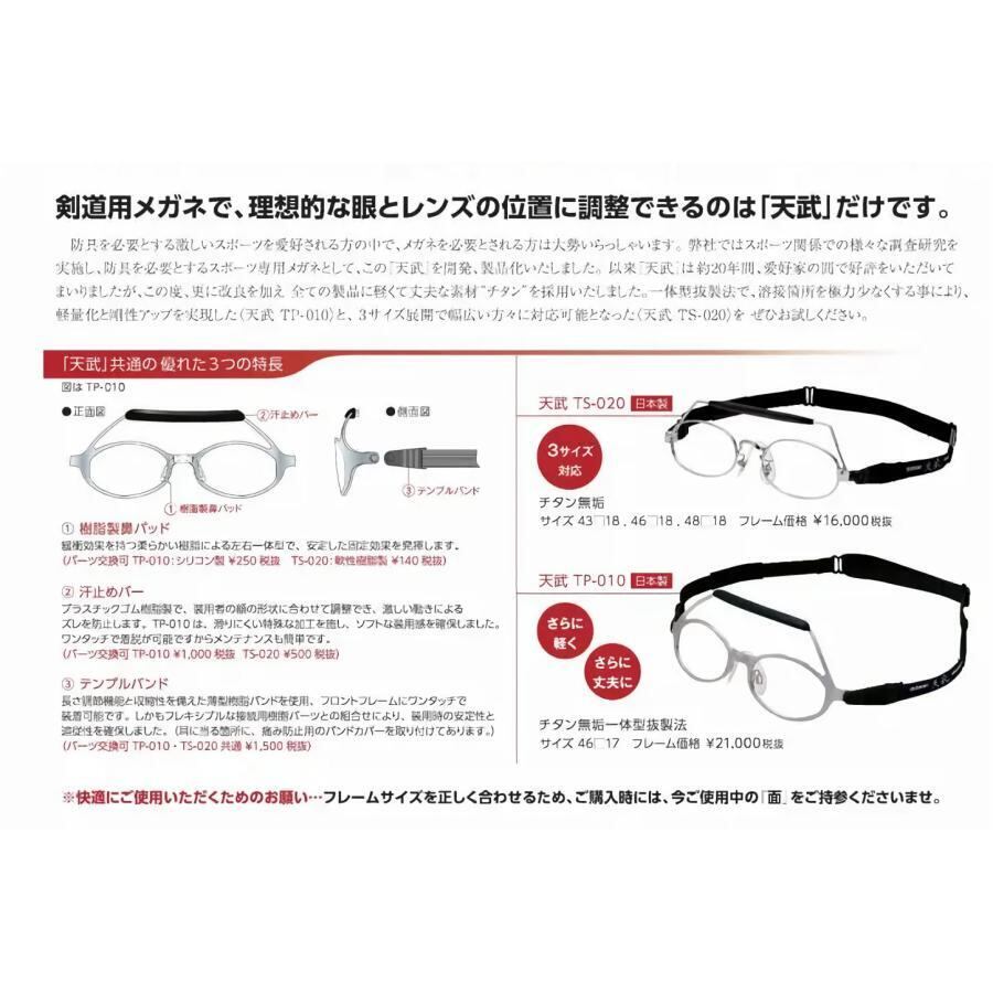 (お取り寄せ)剣道用メガネフレーム 天武 UTS-020 48サイズ テンム チタン 汗止めバー ソフトタイプ鼻パッド 剣道面対応メガネ 剣道防具用メガネ
