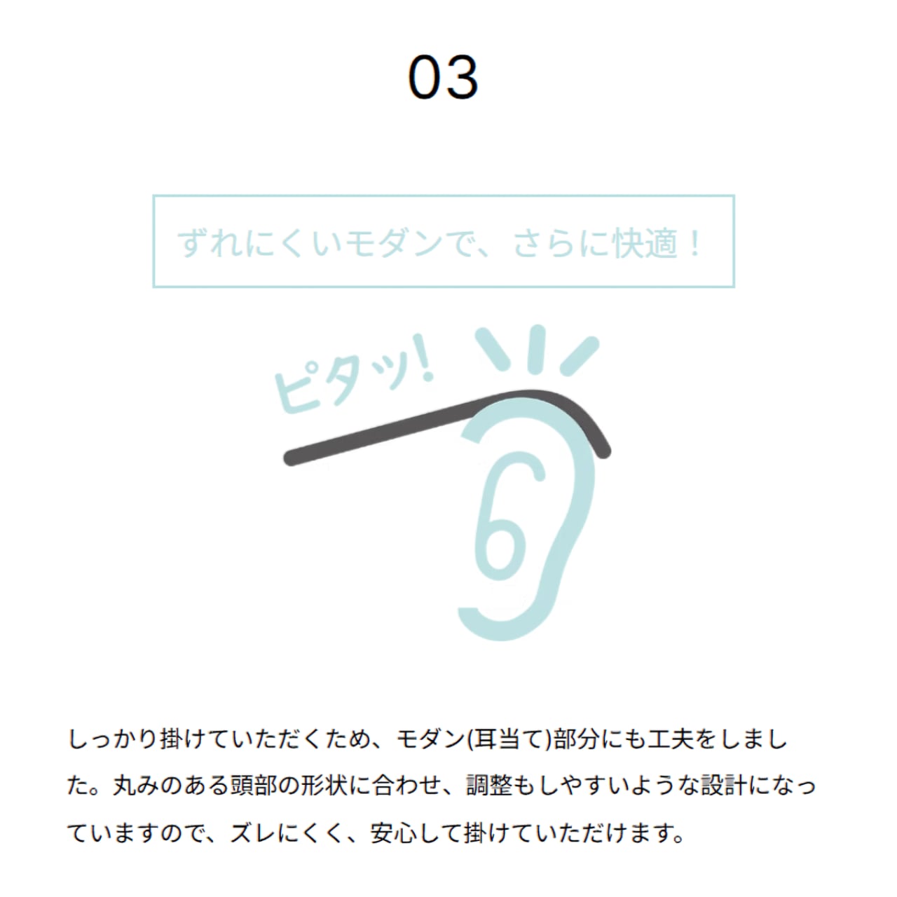 日本人の頭部形状を研究し、設計されたフレームは、長時間かけても疲れない快適な掛け心地を実現しています。