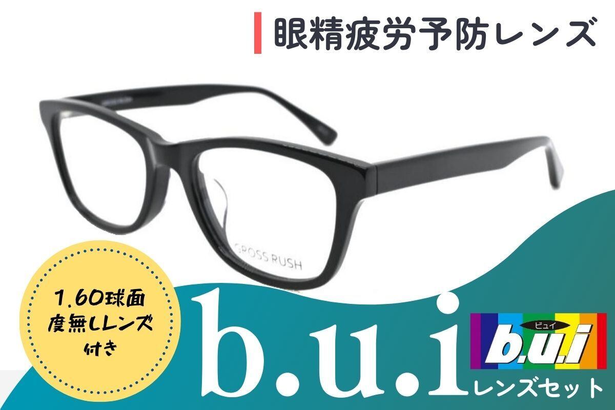 【b.u.iセット】GROSS RUSH グロスラッシュ GR-101 col.1 ブラック 53サイズ 眼精疲労予防レンズ b.u.i 目に優しい 眩しさに弱い方に ブルーライト 青山眼鏡