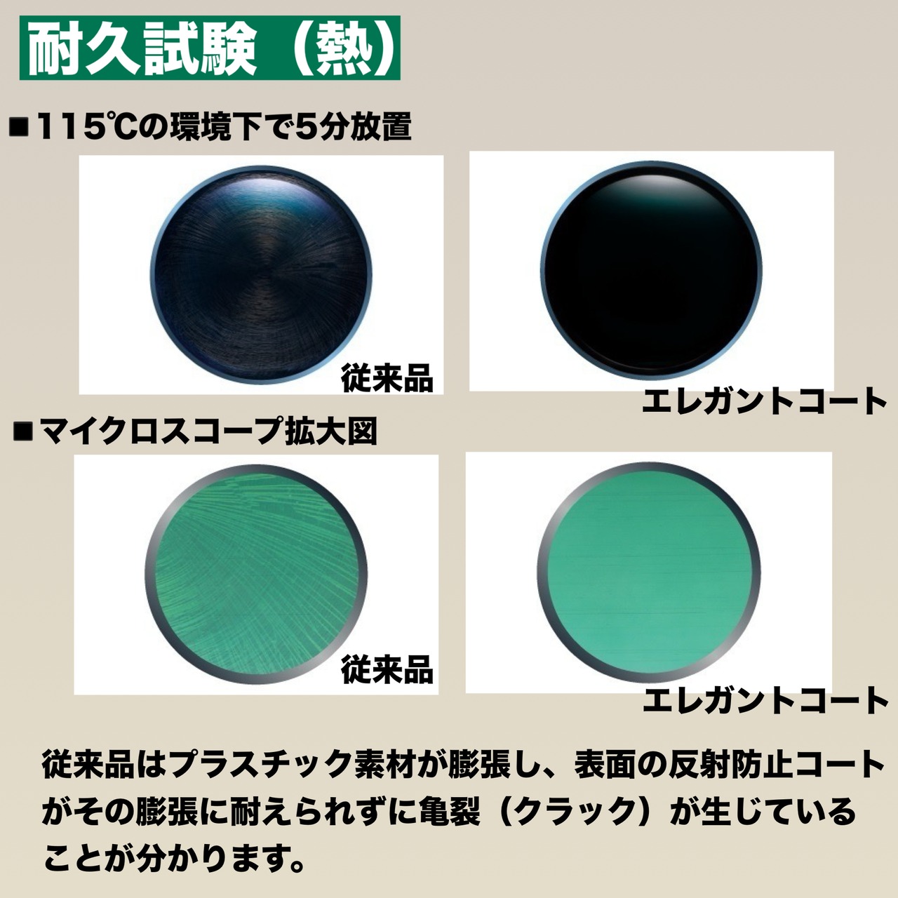 さらには新開発の真空蒸着技術により、プラスチックレンズの弱点であった熱によるコーティングへのダメージを低減させることに成功。