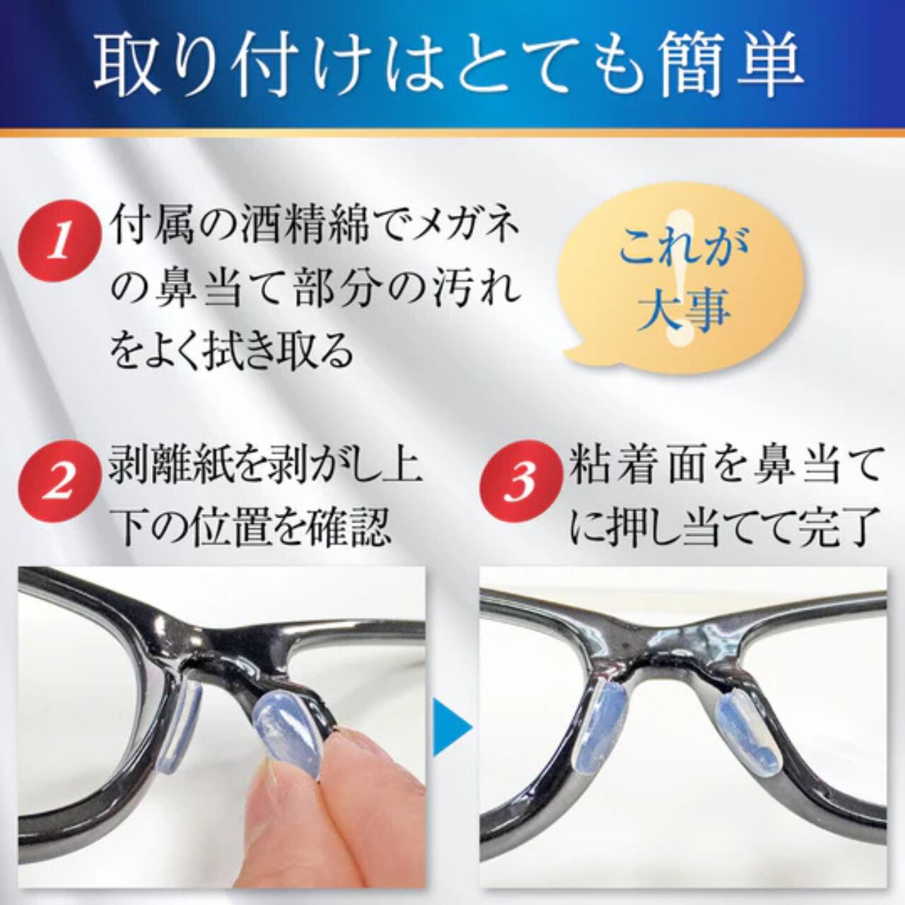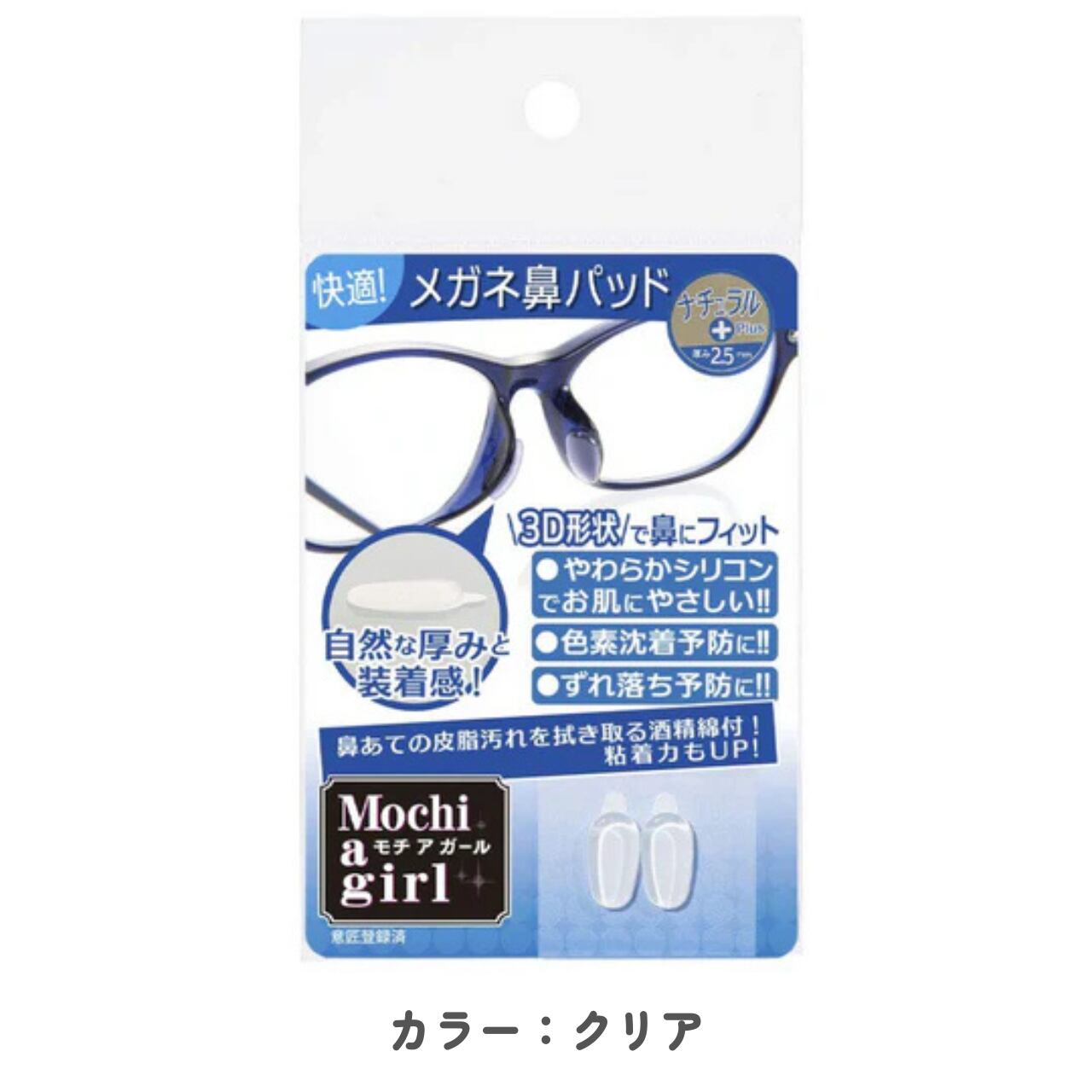 モチアガール ナチュラルプラスは、メガネ・サングラスの鼻あてに貼るだけの透明シリコン製鼻パッド。